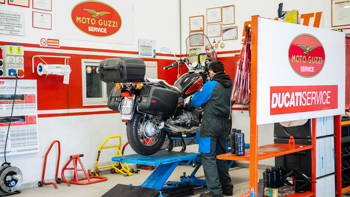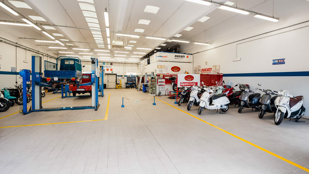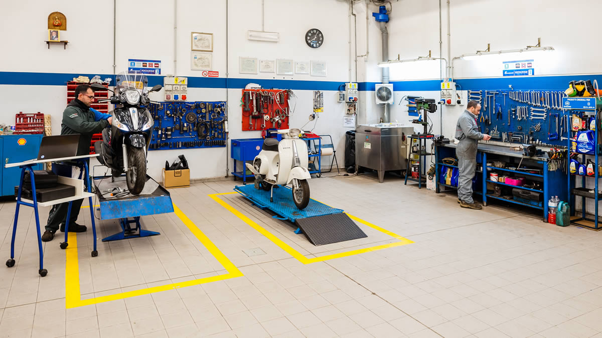 350 mq di officina ufficiale Piaggio - Guzzi Prime Service, Fantic motor, Benelli - Keeway service ufficiale, Mash composta da un team di tecnici esperti e di grande competenza tecnica.